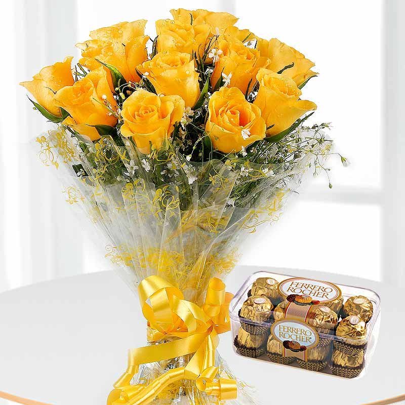 This combo consists of a 12 Yellow Roses Bunch, a box of 16 Ferrrero Rocher.