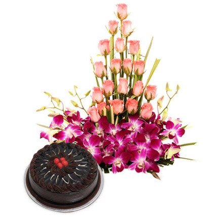 Send this basket arrangement of 6 sensual purple orchids balanced by the heat and passion of the 20 pink roses and 1 kg Chocolate Truffle Cake. A perfect gift for lovers at occasions like birthday, anniversary, wedding or any other special occasion.