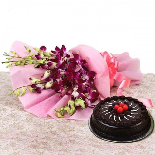 6 purple orchids with a delicious 500gm truffle cake