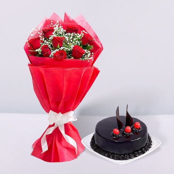 Home Flower Bouquet Red Roses and Chocolate Cake