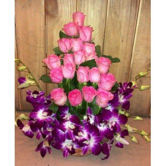 Arrangement of 20 pink roses, 10 orchid stems in a designer basket
