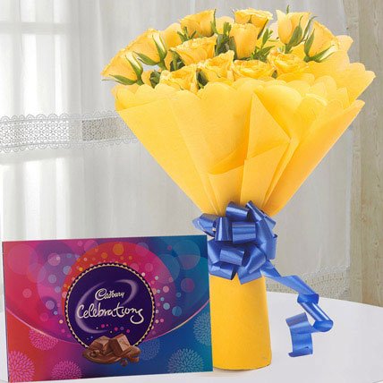Flowernpetals have the solution to your situation with a combo gift of 12 yellow roses and a Cadbury Celebration box. Yellow is the quintessential color of friendship, joy, and excitement and chocolate increases the happiness of mind. So, this combo would mark a fabulous celebration time for you.